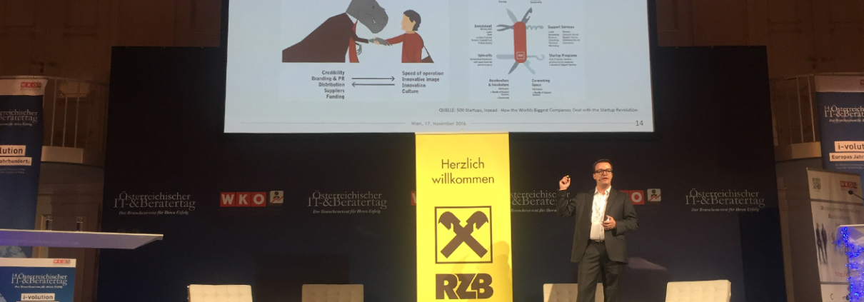 “i-volution” – Europe’s path becoming a global innovation leader was the overall topic of the 14. IT- & Beratertag in the Vienna Hofburg. Raiffeisen Digital Banking & Innovation used the opportunity to present innovative startups on stage. Our CEO Berthold Baurek-Karlic provided an intro to the topic, explaining why Corporate Startup Engagement (CSE) is gaining awareness in Austria and Europe. The main reason being the fourth industrial revolution, which brings us highly automated processes and a further expansion of digital technology. This development is pushed forward through broadband access, almost unlimited memory capacity, object-oriented coding, unified modelling language, and quantum computing. These technologies make it easier and cheaper for new players to launch a business and challenge established companies. One strategy for corporates to encounter this development is by working closely with startups and therefore gaining access to innovation and new business opportunities.