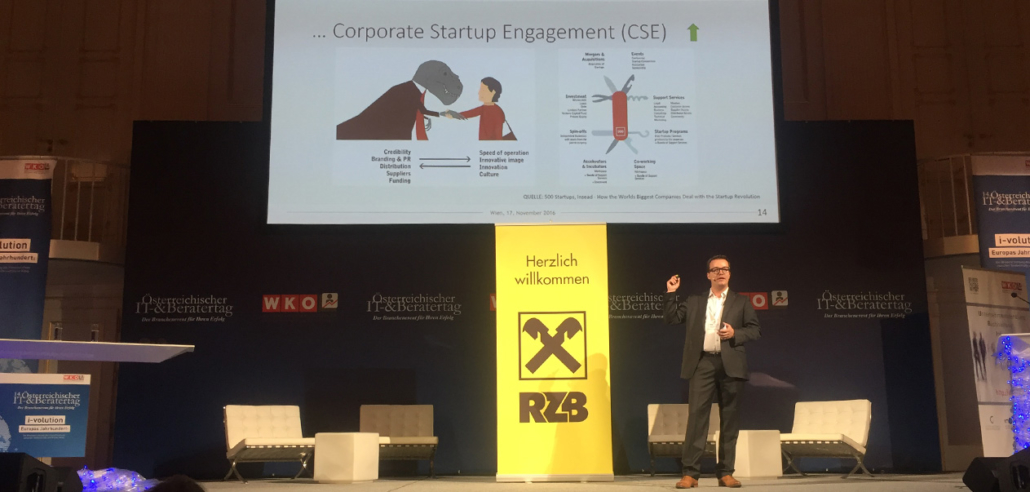 “i-volution” – Europe’s path becoming a global innovation leader was the overall topic of the 14. IT- & Beratertag in the Vienna Hofburg. Raiffeisen Digital Banking & Innovation used the opportunity to present innovative startups on stage. Our CEO Berthold Baurek-Karlic provided an intro to the topic, explaining why Corporate Startup Engagement (CSE) is gaining awareness in Austria and Europe. The main reason being the fourth industrial revolution, which brings us highly automated processes and a further expansion of digital technology. This development is pushed forward through broadband access, almost unlimited memory capacity, object-oriented coding, unified modelling language, and quantum computing. These technologies make it easier and cheaper for new players to launch a business and challenge established companies. One strategy for corporates to encounter this development is by working closely with startups and therefore gaining access to innovation and new business opportunities.