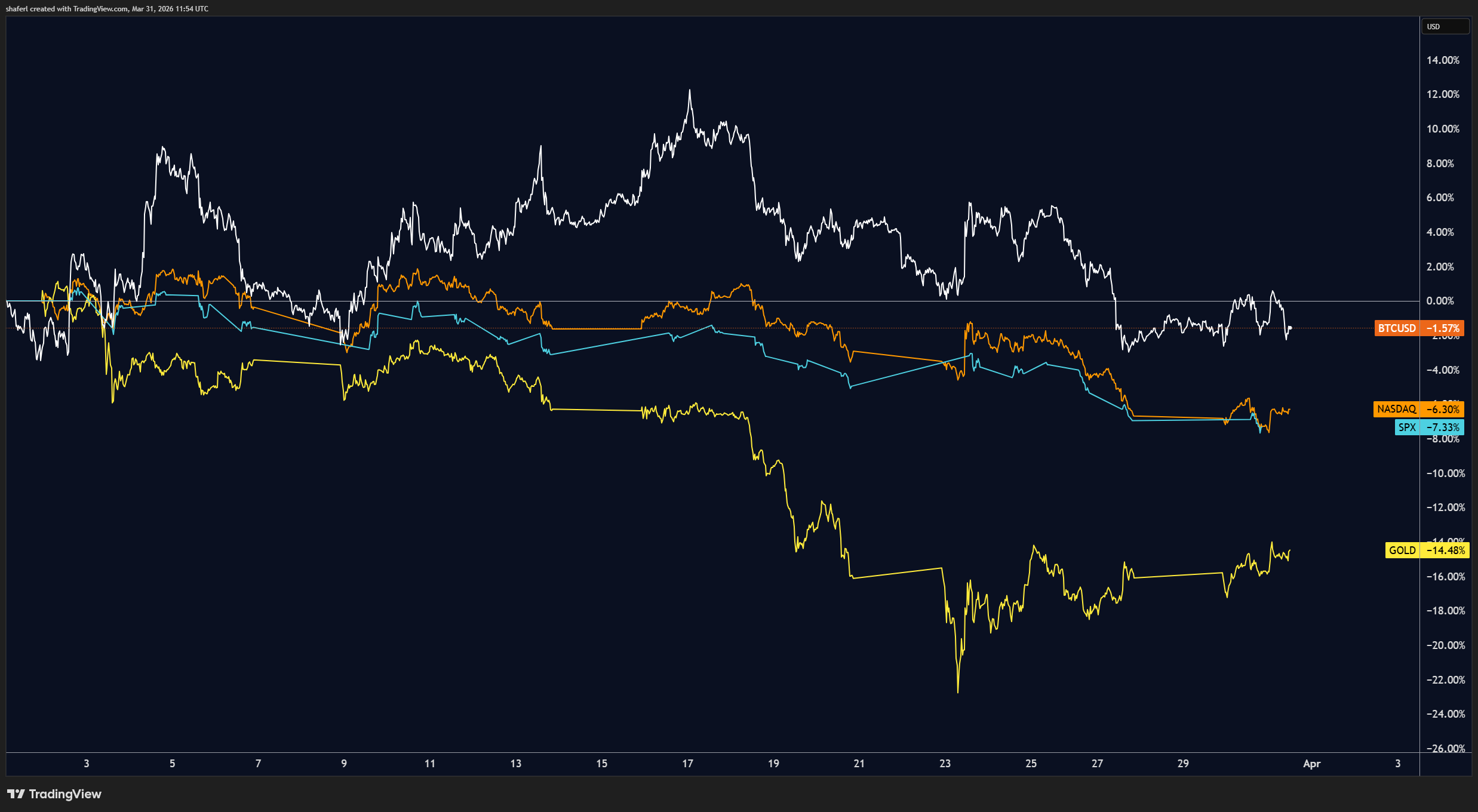 Fig. 2: BTC – NASDAQ – S&P 500 – Gold Comparison